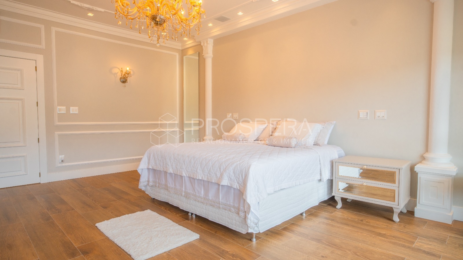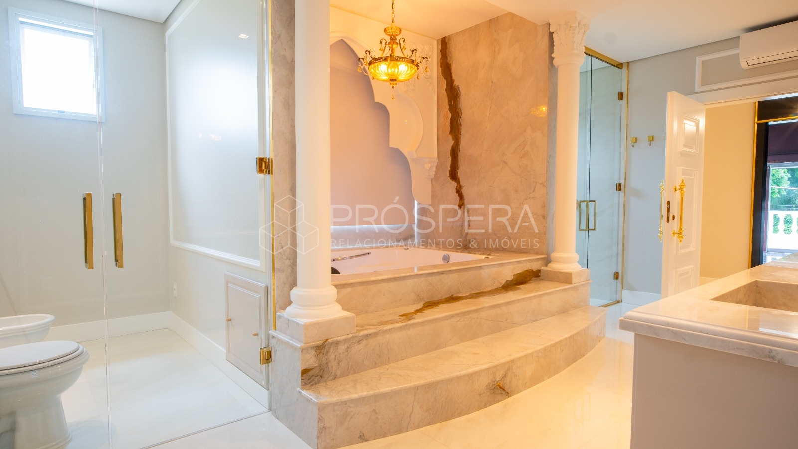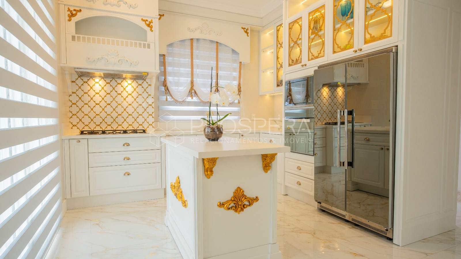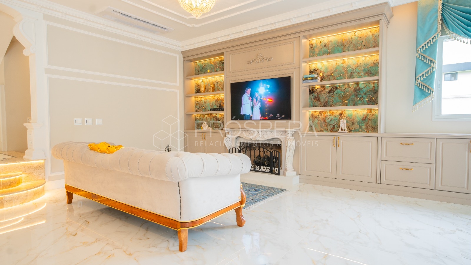 Móveis Chateau Blanc, cortinas em veludo e brocados, revestimentos em pedras nobres e semi preciosas