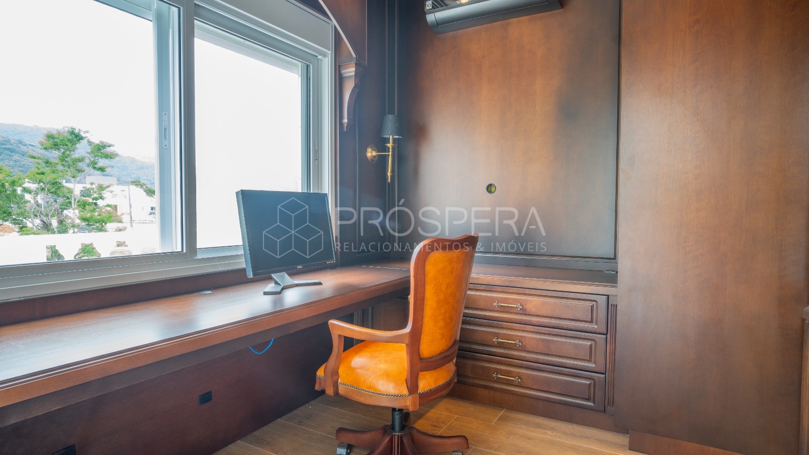 Escritório com vista para a piscina